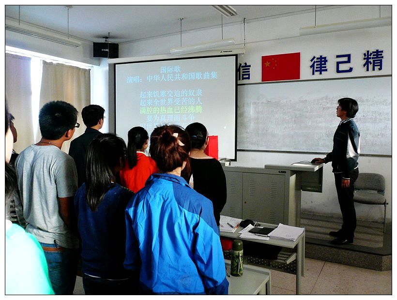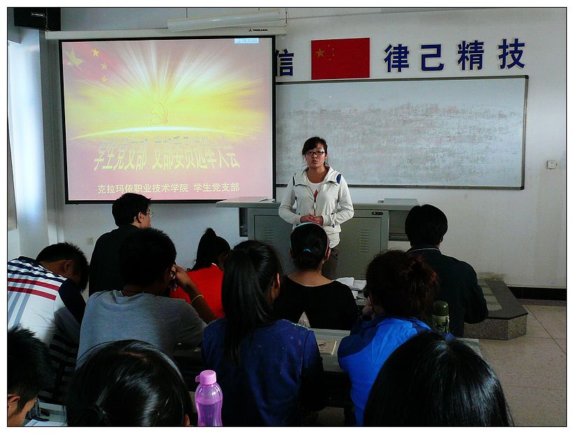 大会在庄严的国歌声中开始,刘少华老师,宣读了《克拉玛依职业技术学院 学生党支部换届选举办法》,要求全体党员切实履行党员权利,为此次换届选举投出自己神圣的一票。 为了确保选举出思想上进、德才兼备、品学兼优的同学进入新一届学生党支部委员,此次选举大会按照候选人由自愿申请、党员投票、组织审查相结合的办法产生。在支委候选人上台竞选环节,各候选人上台来阐述自己的竞聘理由,博得台下党员的热情掌声。在选票上,参选人为新一届委员投下神圣的一票。经过近一个小时的选举和投票后,此次选举大会在雄壮的《国际歌》结束。