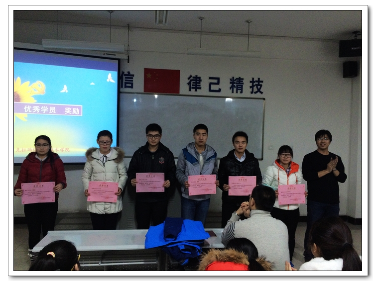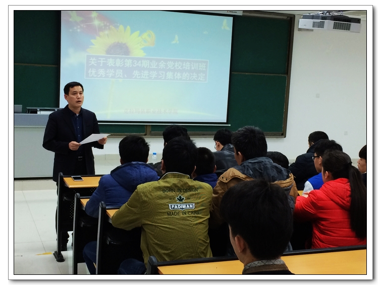 在学习期间能够自觉遵守业余党校的管理规定,勤奋好学,涌现出一批品学兼优的优秀学员和先进学习集体。为了鼓励先进,调动学员学习和工作的积极性,由刘冰柏同志宣读-关于表彰第34期业余党校 “先进学习集体”、“优秀学员”的决定授予采油1431班韩伟伟等7人为“优秀学员”荣誉称号,石化系党支部、电子电气系党支部为“先进学习集体”。