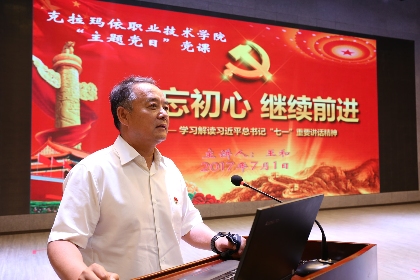 庆祝大会上由学院党委书记、院长王和同志为大家做七一主题党日专题党课《不忘初心,继续前进》,从四个方面解读了《不忘初心,继续前进》的内涵,号召我们紧密团结在以习近平同志为核心的党中央周围,紧紧围绕总目标,以推进“两学一做”学习教育常态化制度化为契机,抢抓机遇,开拓创新,扎实工作,不辱使命。学院广大党员干部要对标先进,积极向先进党员干部学习,做到心中有党、心中有民、心中有责、心中有戒,内化于心、外化于行,要进一步提振干事创业的精气神,不忘初心,继续前进,扎实推动各项工作再上新台阶,积极开展全国优质高职建设,为实现社会稳定和长治久安贡献自己的力量!以实际行动迎接党的十九大胜利召开!
